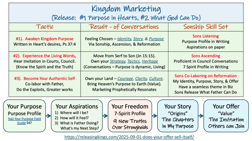 Bottom line – This progression works in business. We can choose to spend our lives and businesses doing what Father is doing and filling the earth with His glory. Your roadmap to connect purpose with your business offer is shown below: