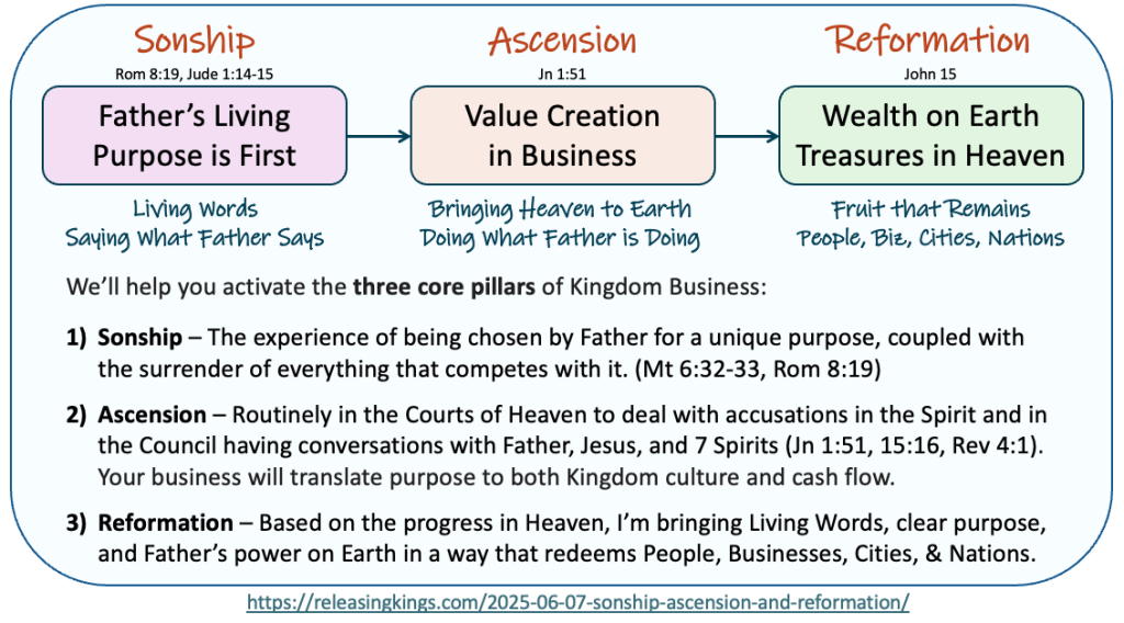 Start with Conversation – Sonship is an identity shift that occurs after salvation. The result of this shift is the understanding that our Father wants to communicate with us, include us in His presence, and to empower us and send us with His purpose. Saying “yes” to this shift towards sonship opens the door to ascension to Father’s Council and conversations with Father, Jesus, and the seven Spirits. Awareness of what Father is doing and how our daily purpose aligns with our larger calling is what brings clarity to our lives and businesses. We are no longer serving ourselves; instead, we are engaged in a much larger purpose that Father accomplishes through His sons and daughters. Jesus was the firstborn, and we are His brothers and sisters, performing greater works with Him and in His Name… all the way to Reformation of Nations!