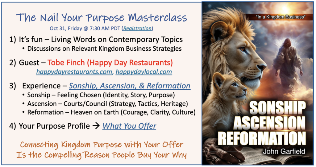 Progression to Sonship â Your Kingdom Purpose and redemptive stories form the basis for your personal identity, purpose, value creation, and your business offer. Becoming your authentic self is the practical key to flow and fruit in business and life. We offer a practical and prophetic approach to help you get there, flowing with your Father (co-laboring) instead of fighting circumstances and resistance alone.
