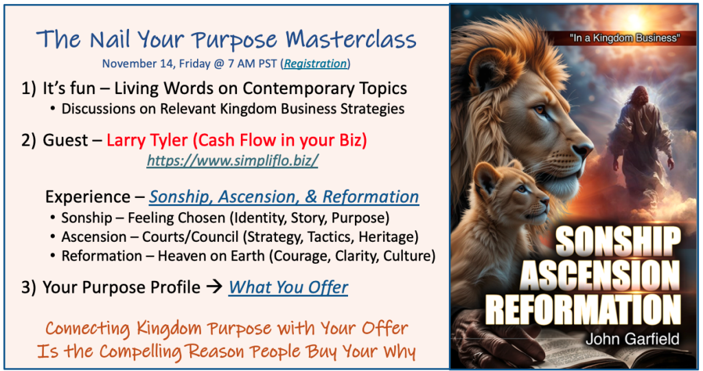 The bottom line is that sons and daughters can intentionally co-labor with Father via conversations in the Council to bring Father’s purpose to earth in a Reformation that is very good for cash flow and very motivating for the business culture. Purpose replaces the chaos and theft. Sons are intentional about getting clarity on Father’s purpose from their seat in Heavenly places.