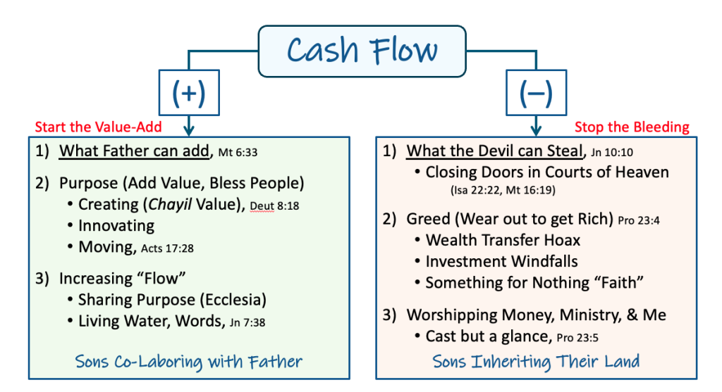 The two levers to prayerfully manage cash flow and follow the Lamb at the same time are shown in the graphic below: 1) stop bleeding cash, and 2) start adding the value that Father can bring. It’s not just what we can do, sonship is really a metric for what God can do through you!