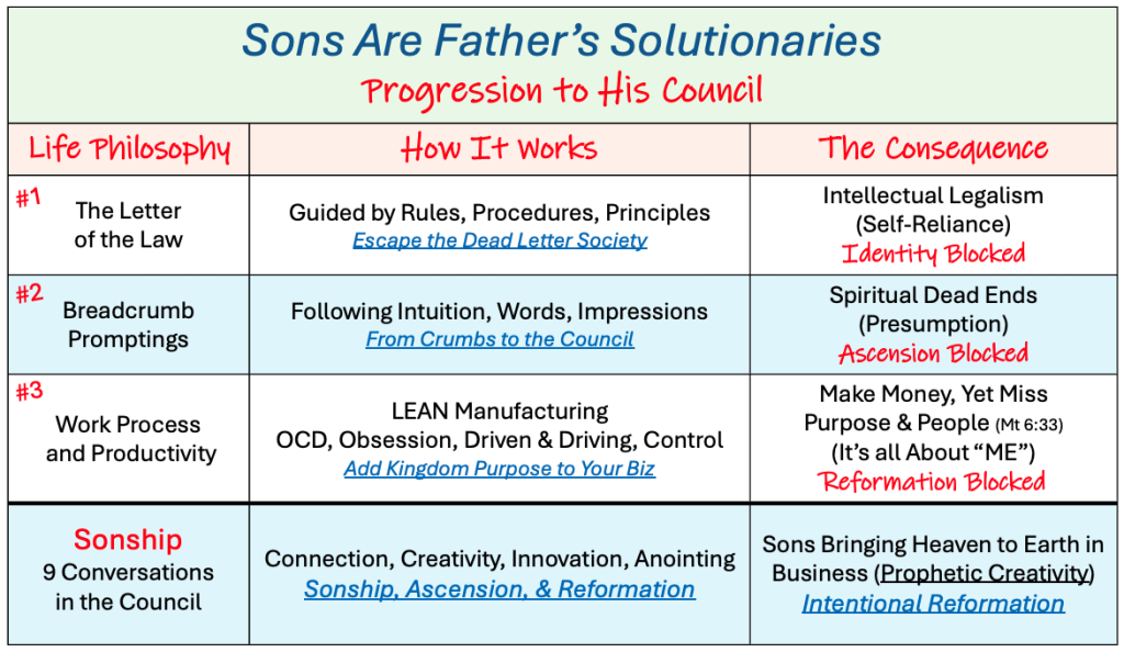 Intro Video – Three dangerous philosophies masquerade as spiritual maturity in Christian business. Each promises progress. Each delivers a different form of bondage. And each prevents you from accessing the one thing that produces Kingdom advancement: your seat in Heaven’s Council. All three are summarized in the graphic and described in the paragraphs below to make the contrast with Sonship.