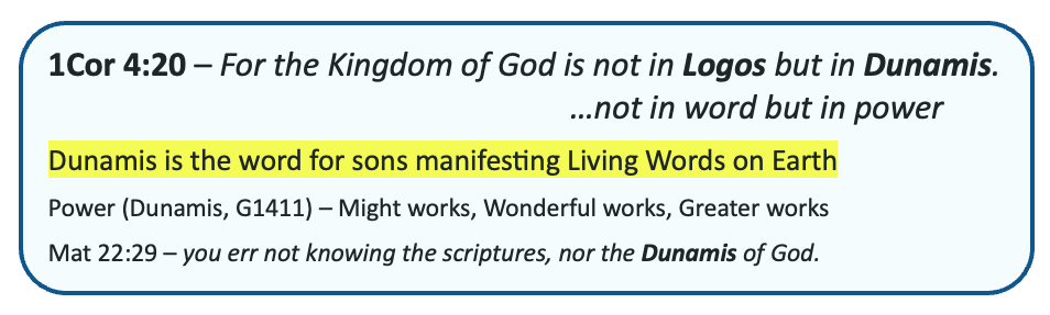 Paul didn’t mince words: “The Kingdom of God is not in logos but in Dunamis” (1 Corinthians 4:20). Not in word, but in power. Dunamis (G1411) refers to miraculous power, mighty works—the “greater works” Jesus promised.