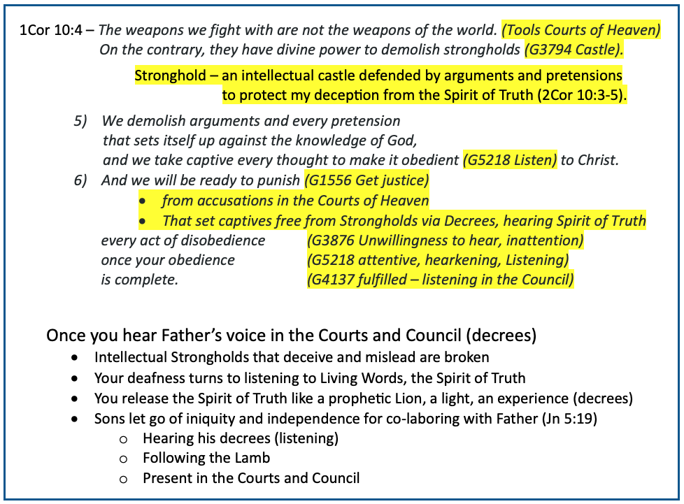 - Consequences: Sons are cut off from the very weapons Paul describes in 2 Cor 10 — the divine power needed to demolish strongholds. The Courts of Heaven and Council conversations become nonsensical categories. Christianity is reduced to historical study and moral improvement. There are no Living Words or decrees. Your seat in heaven (Eph 2:6) and the place Jesus prepared for you (Jn 14:2-3) are just metaphors.